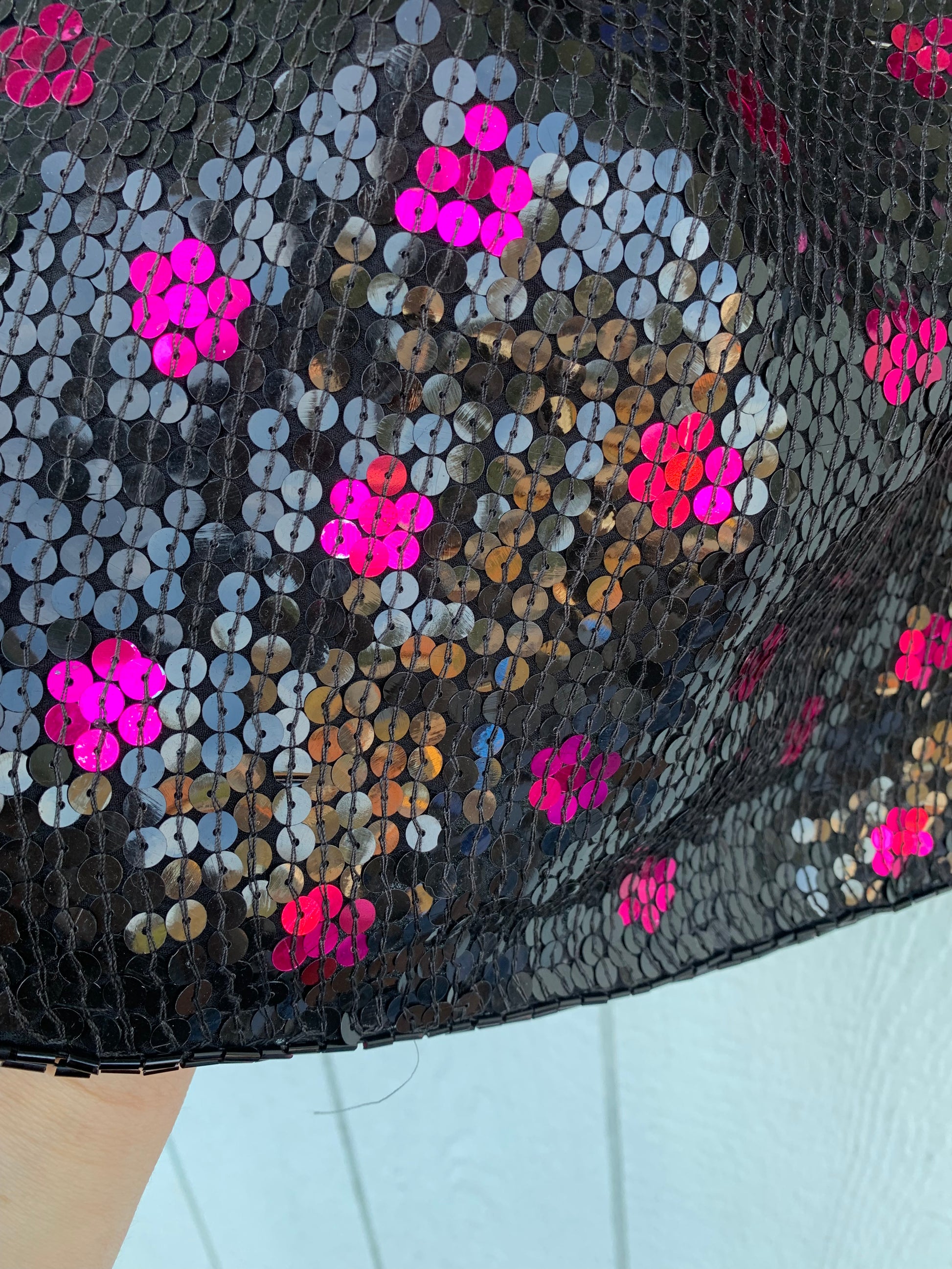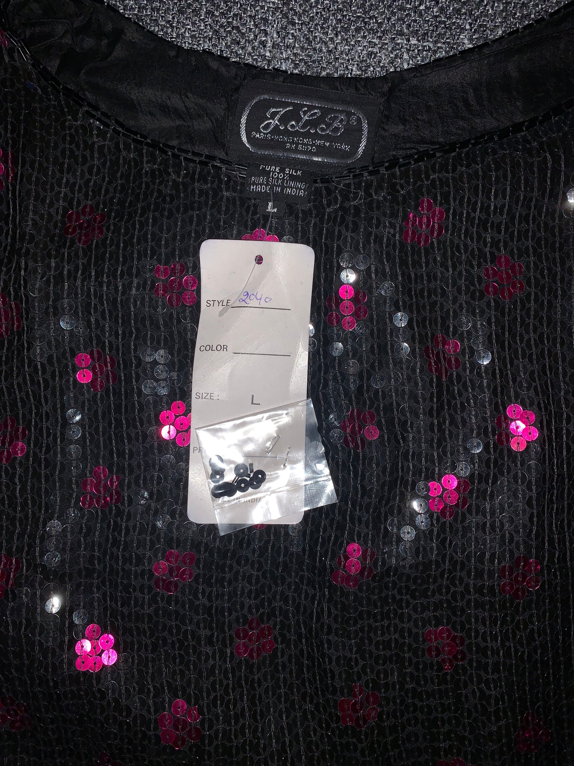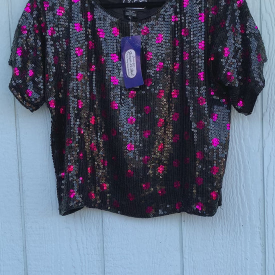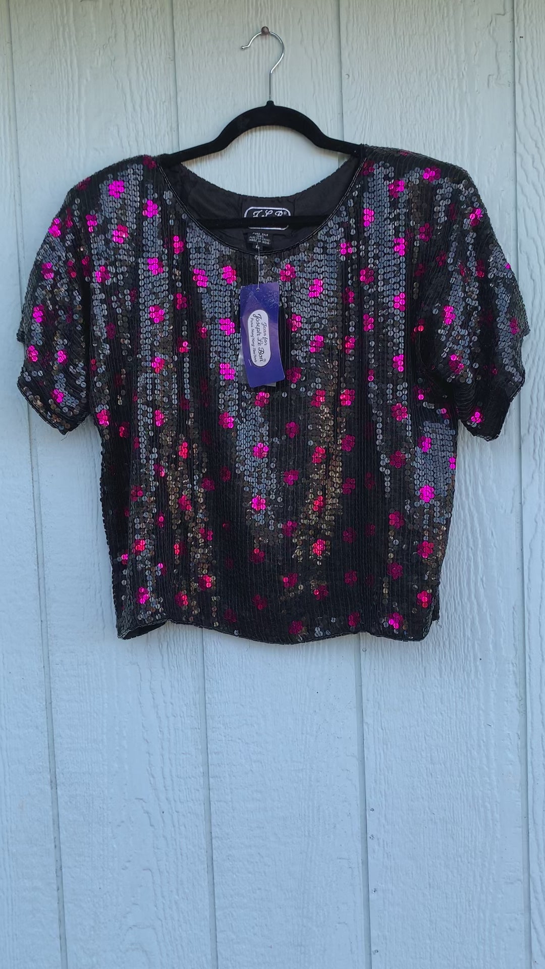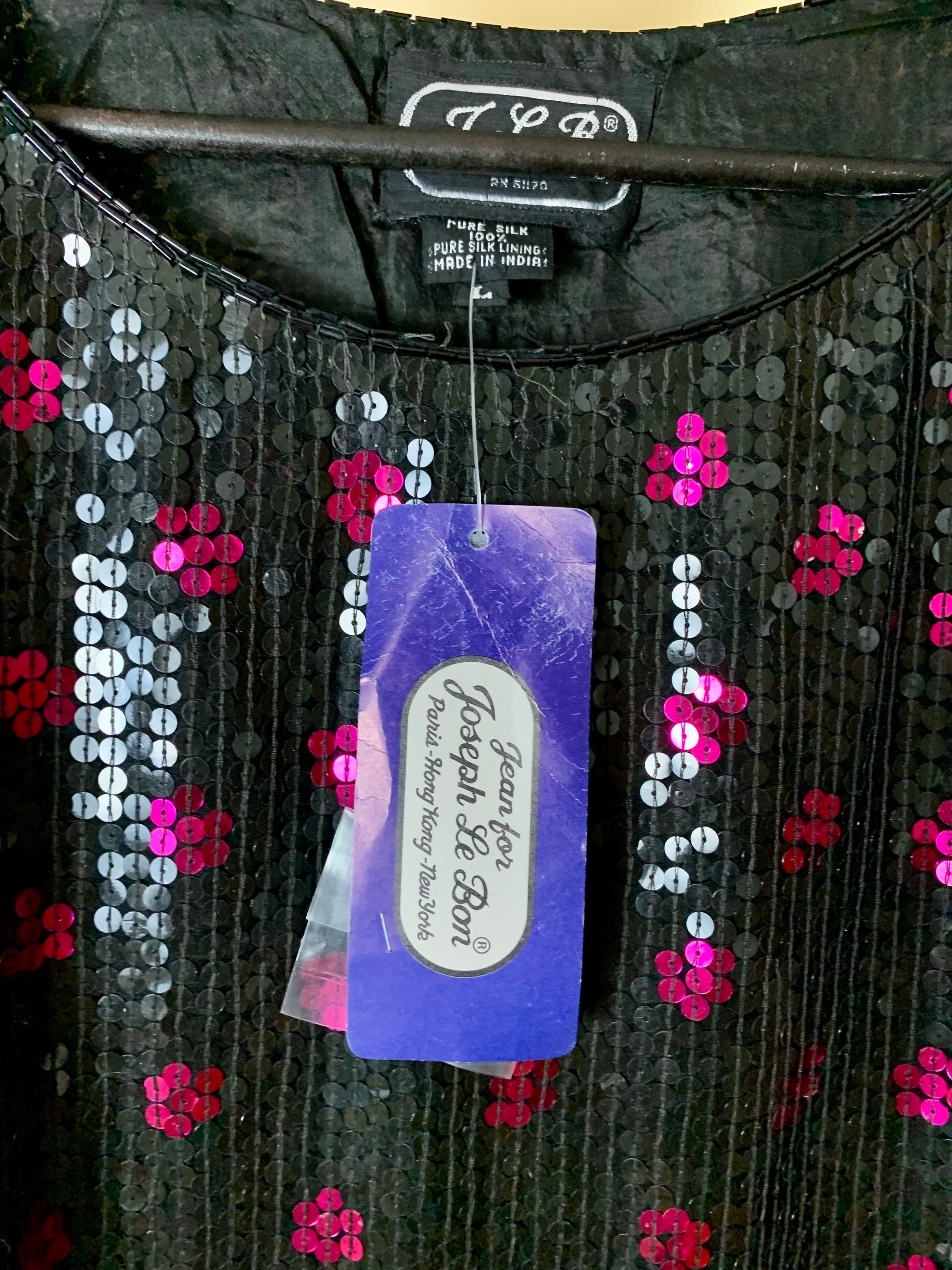 Vintage size Large/ Beautiful New With Tags 100% Silk, beaded neckline sequin top by Jean for Joseph Le Bon. Black with fuchsia geometric shape. For taller folks, this is slightly cropped - check measurements for how it will fit you!