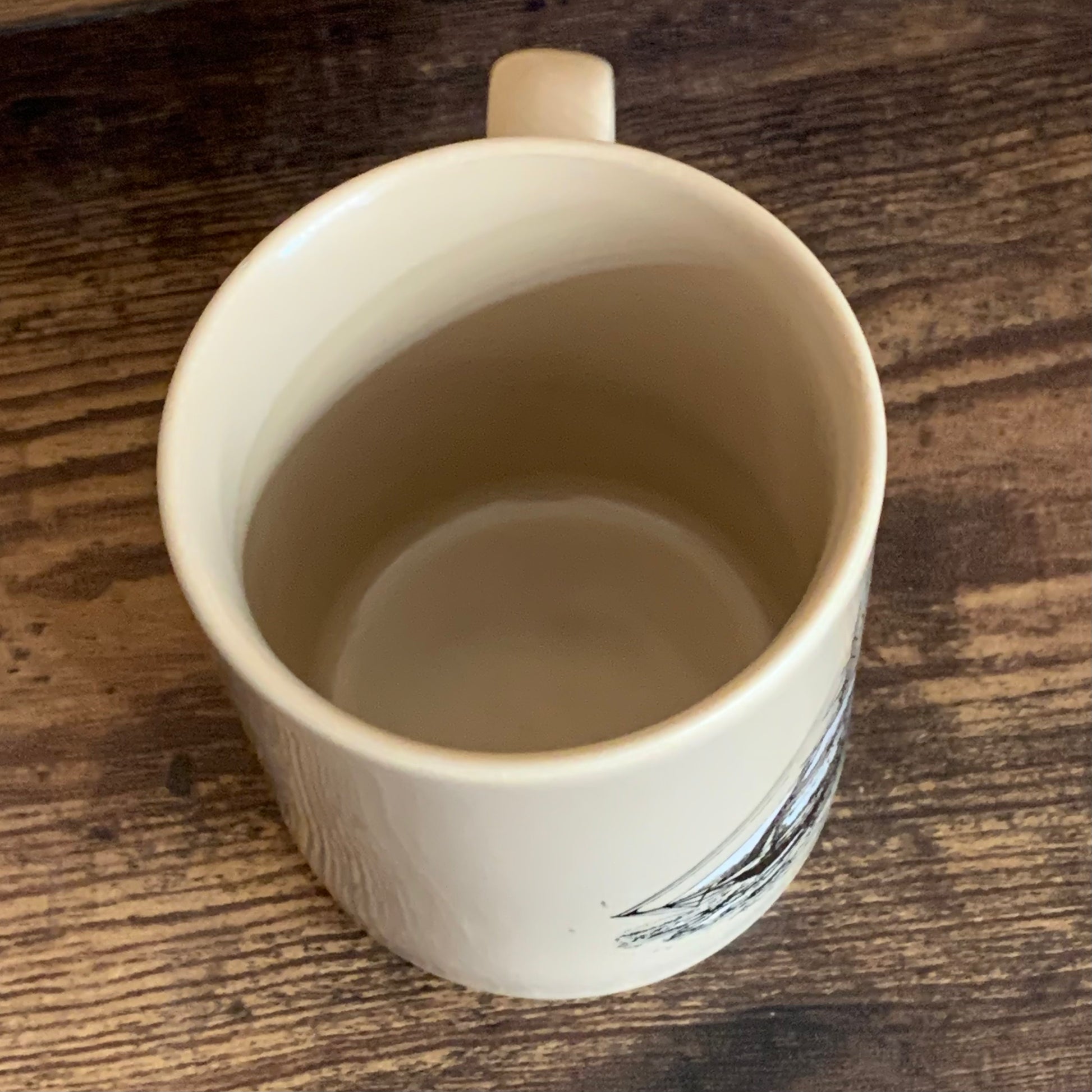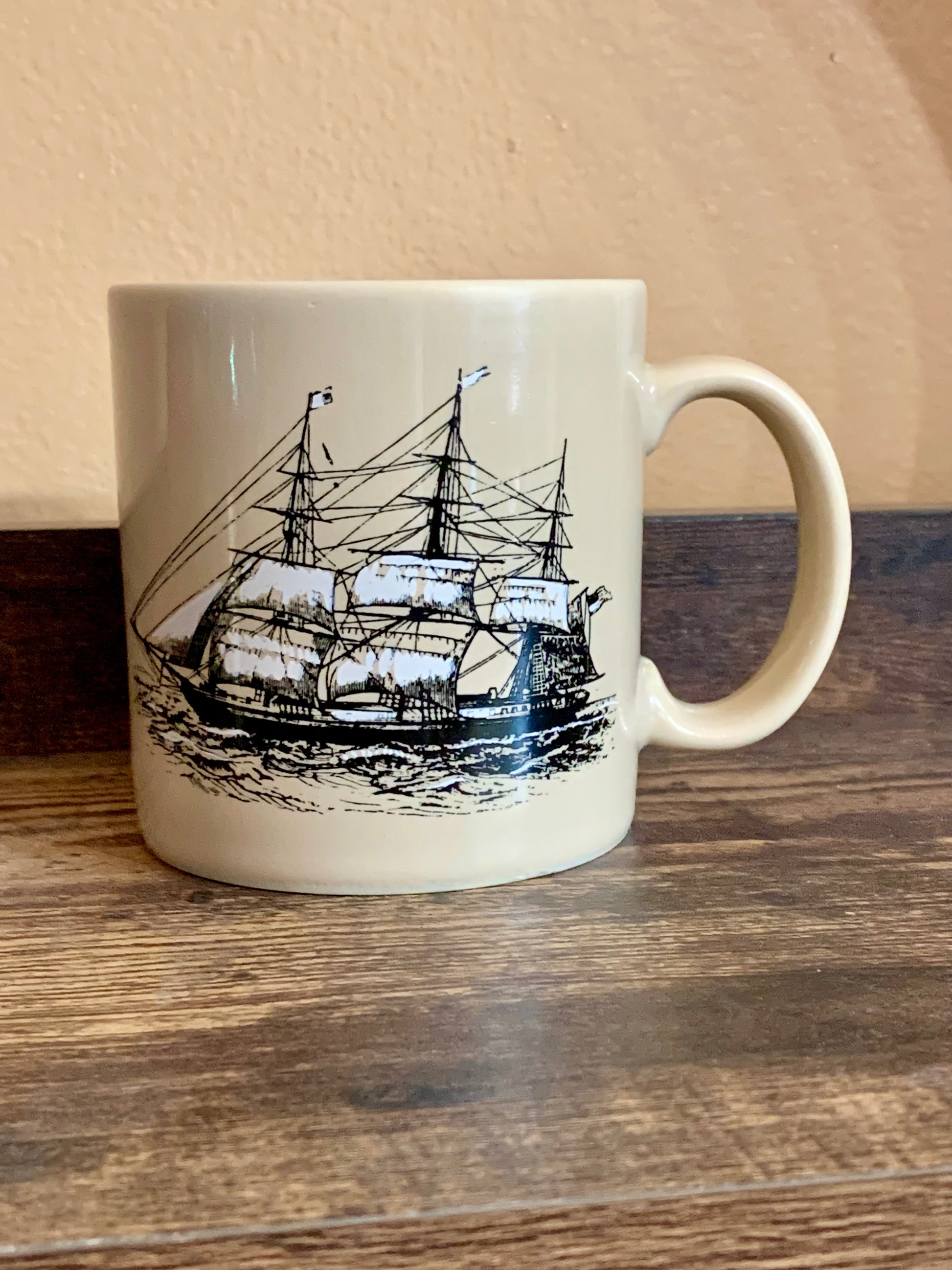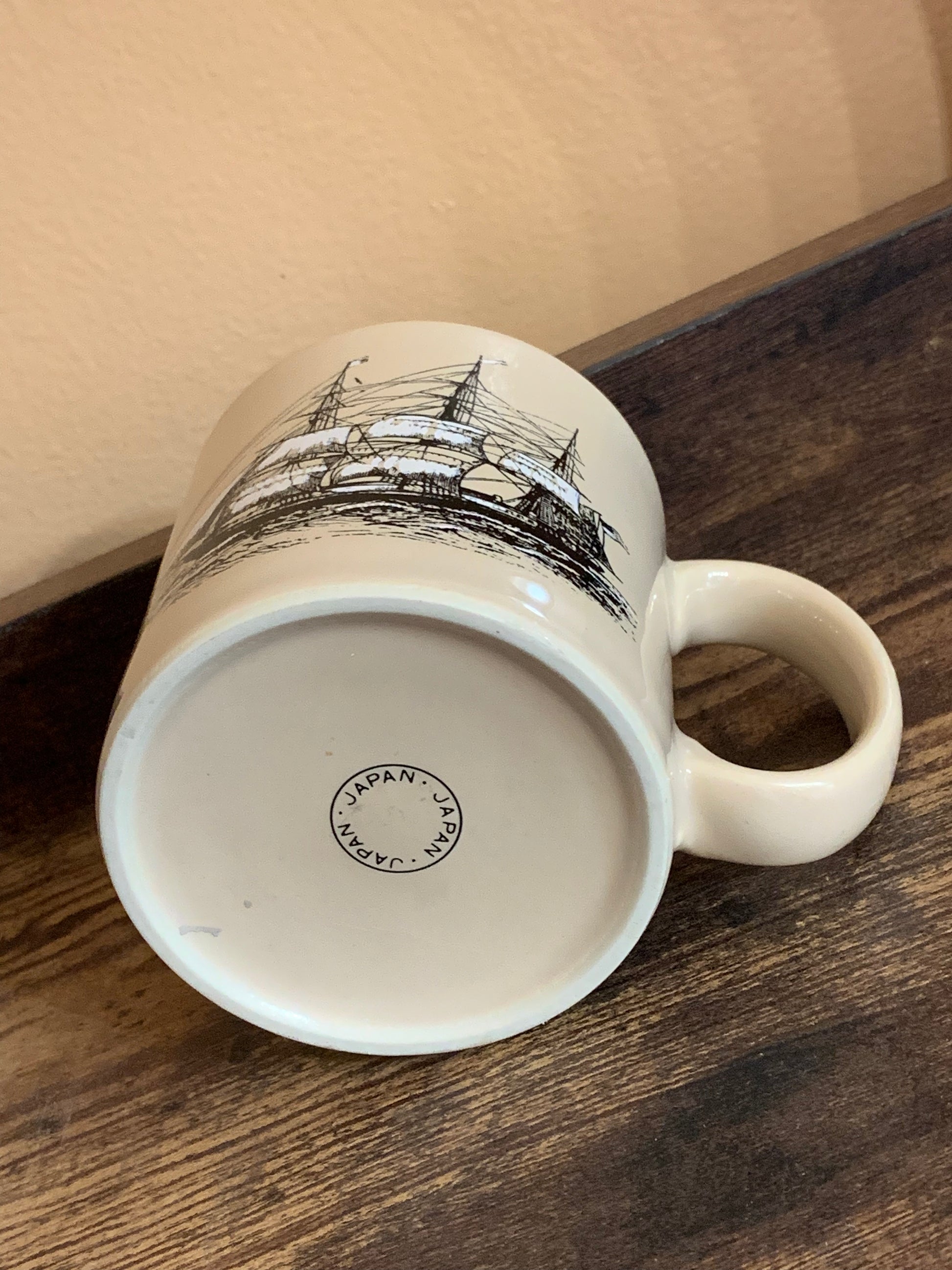 Vintage nautical pirate ship coffee cup. Tan cup with crisp graphic. Bottom is stamped Japan.